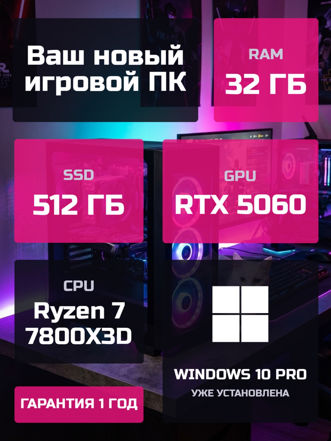 Процессор AMD Ryzen 7 7800X3D8 ядер · 16 потоков · 4.2 → 5.0 ГГц