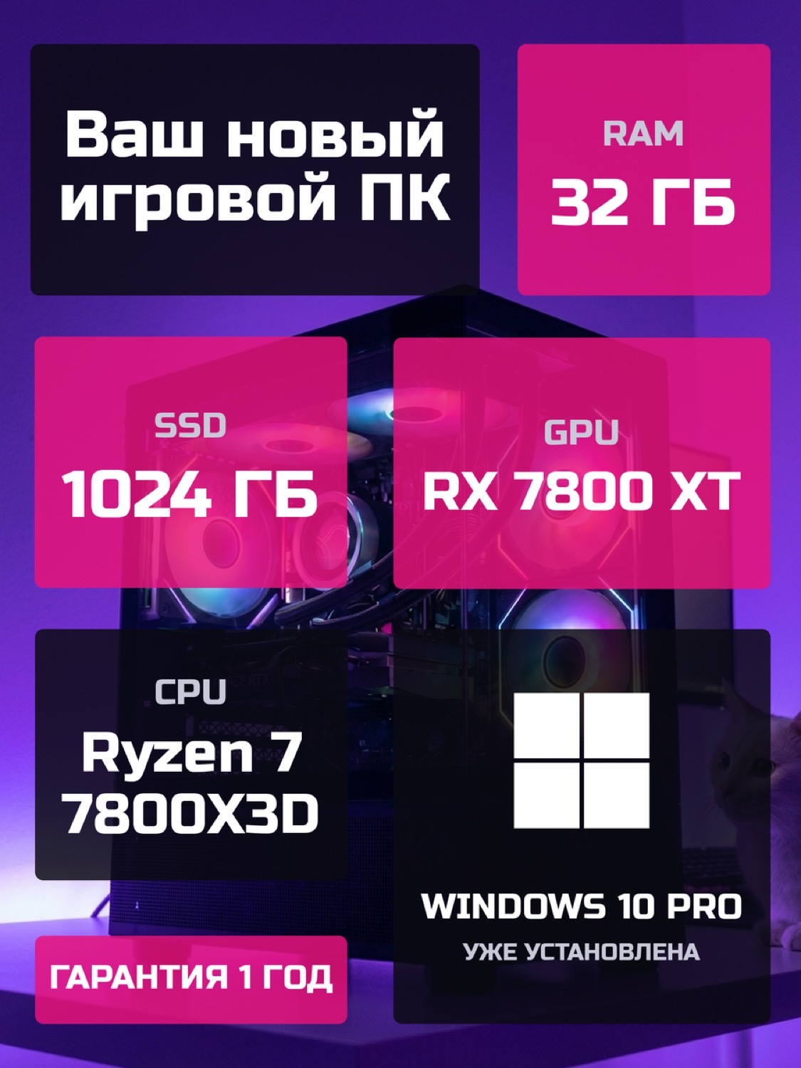 Процессор AMD Ryzen 7 7800X3D8 ядер · 16 потоков · 4.2 → 5.0 ГГц